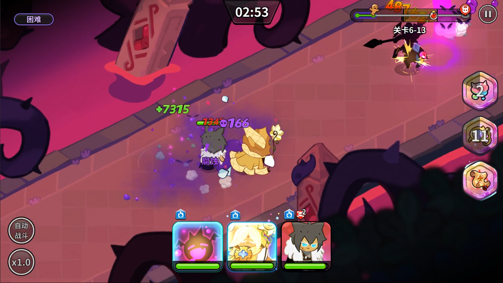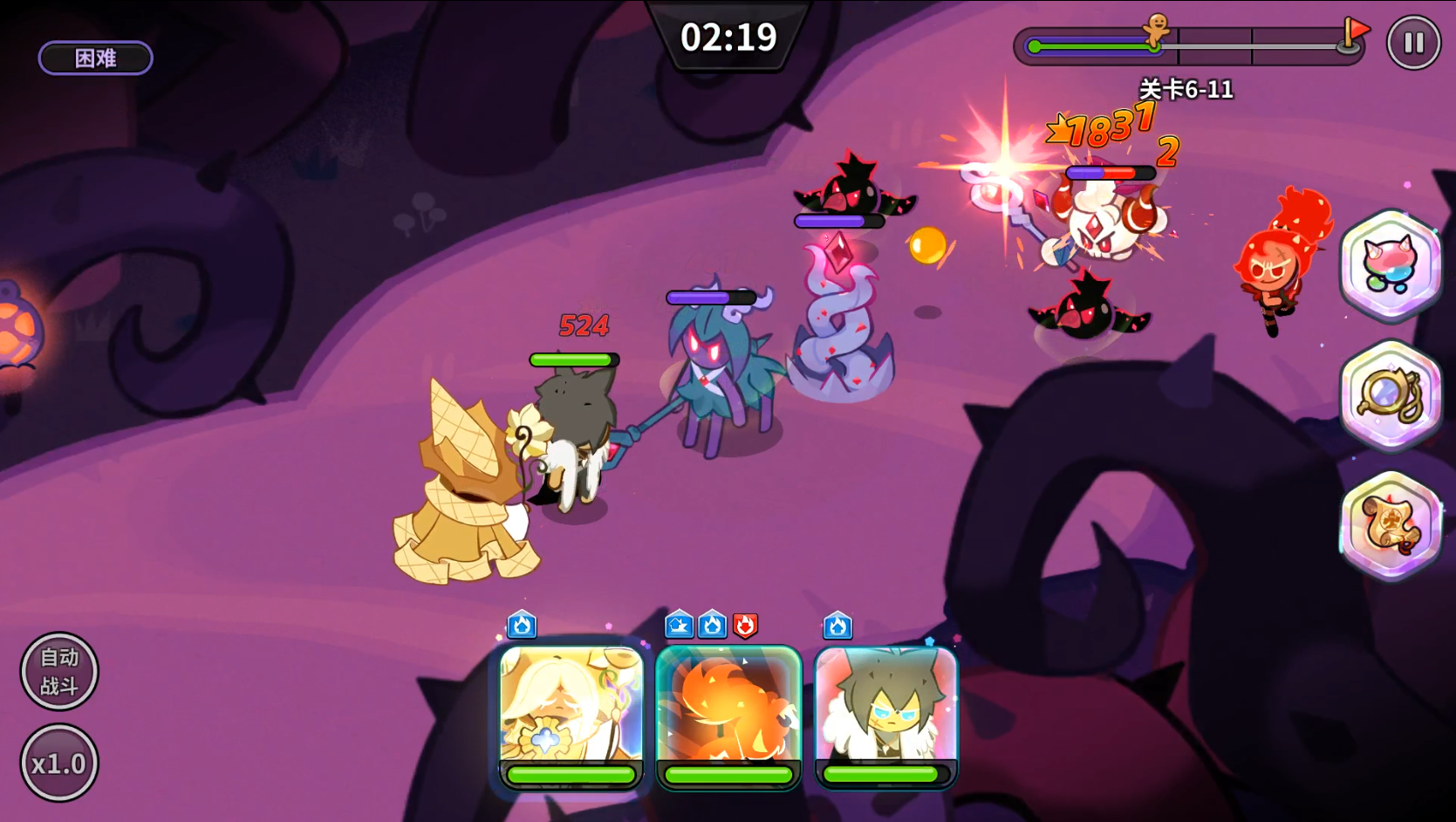其中德古拉饼干是单体伤害最高的,但甜辣酱饼干和黑葡萄干饼干因为是群攻且多段,所以只要两者的攻击目标超过2个,那么打出的总伤害就比德古拉饼干高了。