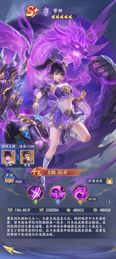 紫妍的战斗力主要集中在技能跟羁绊效果方面,比如在战斗的过程当中,他如果施展了普通攻击技能太虚龙爪。在这样的情况下就能够有效的打出单体爆发,而他的主动技能太虚拳,作为整个战术的核心。一旦施展之后,能够对敌人造成高额的单体伤害,还能够立刻获得自身的生命上限,如果能够持续两个回合的护盾,那么他其实能够有效地抗住敌人的攻击。