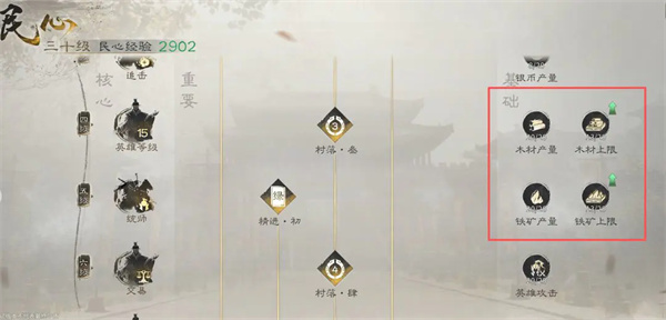 3.准备阶段的核心目标之一,将民心系统中与资源产出相关的条目点满,特别是木材产量、铁矿产量以及各类资源的存储上限。为后续通过修筑城池和建设国家获取名望,提升贡献做好准备。
