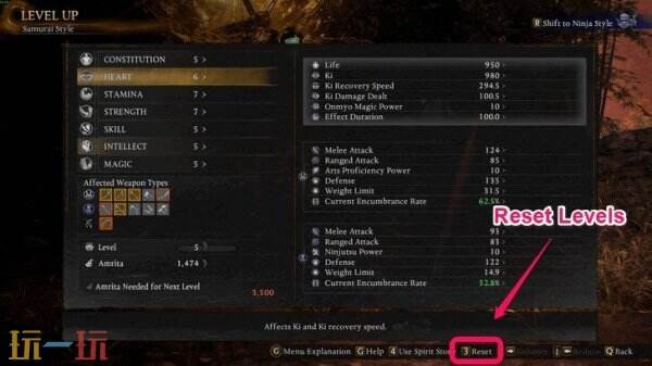 在神社祈祷进入状态界面,按重置键可重置属性、被动与祝福;在主菜单技能界面按重置键,可选择重置单流派或全部武技、忍术,全程免费无限次洗点。