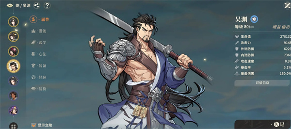 吴渊虽然基础攻击比较拉,但他的基础血量全游的二,仅次于萧公主,经脉还都是加血量的,带苍穹功可以将血量堆到将近28万,再加上进本后还能再加5w血,最终33万血左右,当然这还不是极限,装备没强化满,而且经脉6脉没点。
