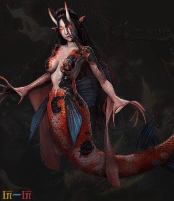 外形特征:一种鱼身人貌的妖怪。下半身似鱼,上半身则近似女性。