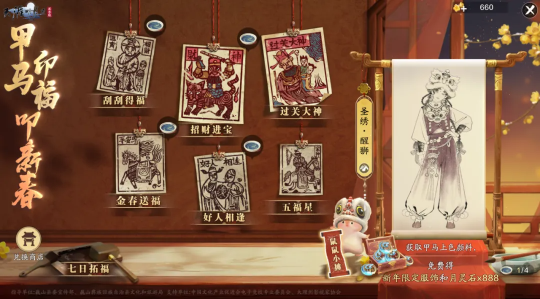 参与新春系列活动可获取甲马上色颜料,集齐四个即可免费兑换月灵石与新年限定普赠外观【圣绣·醒狮】,祝少侠新春大吉,马年顺遂!