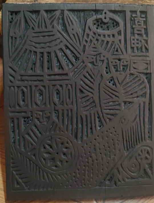 少侠们通过新春活动【七日拓福】,即可大致“学习掌握”到甲马纸的制作工艺。首先需要甄选质密纹匀的梨木良材,将已经勾勒绘制好的纹样团反贴在木板上,严格按照画稿轮廓进行雕刻。