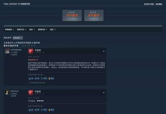 《最终幻想7》PC新版本Steam多半差评,国区玩家指责SE依旧没有加入官方中文,而且存在一些技术问题。