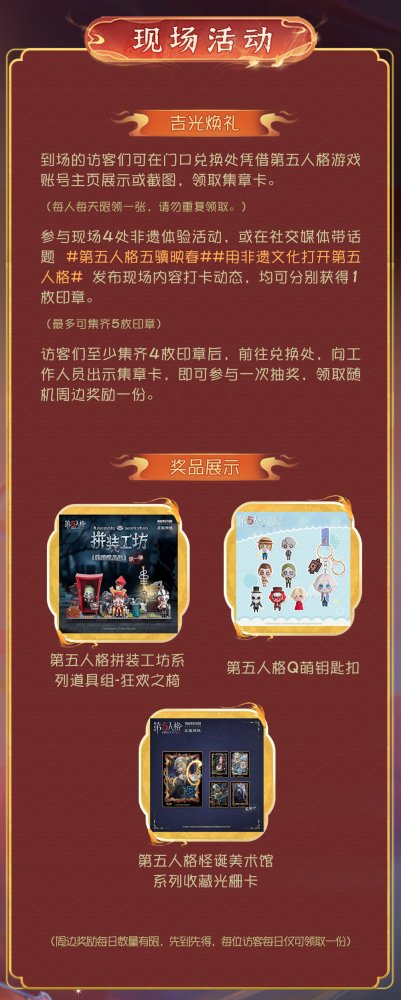 在活动现场设有4处非遗体验活动,前往参与体验活动,或在社交媒体带话题第五人格五骥映春用非遗文化打开第五人格发布现场内容打卡动态,均可分别获得1枚印章。(最多可集齐5款印章)访客们至少集齐4枚印章后,前往兑换处,可参与一次抽奖,领取随机周边奖励一份。