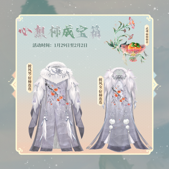 2026年1月29日至2月2日,元宝商城将限时上架【心想柿成宝箱】。开启宝箱可以获得平均价值168元宝的稀有道具,更有几率额外掉落【好柿成双礼盒】!打开礼盒,即可从柿柿如意”武魂幻化与好柿连连”披风中任选其一,为你披上一整年的红火与吉祥。