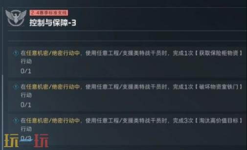 进入对局,使用任意工程/支援类特战干员,完成获取保险柜物资和破坏物资室铁门行动各1次,以及淘汰高价值目标行动3次即可。
