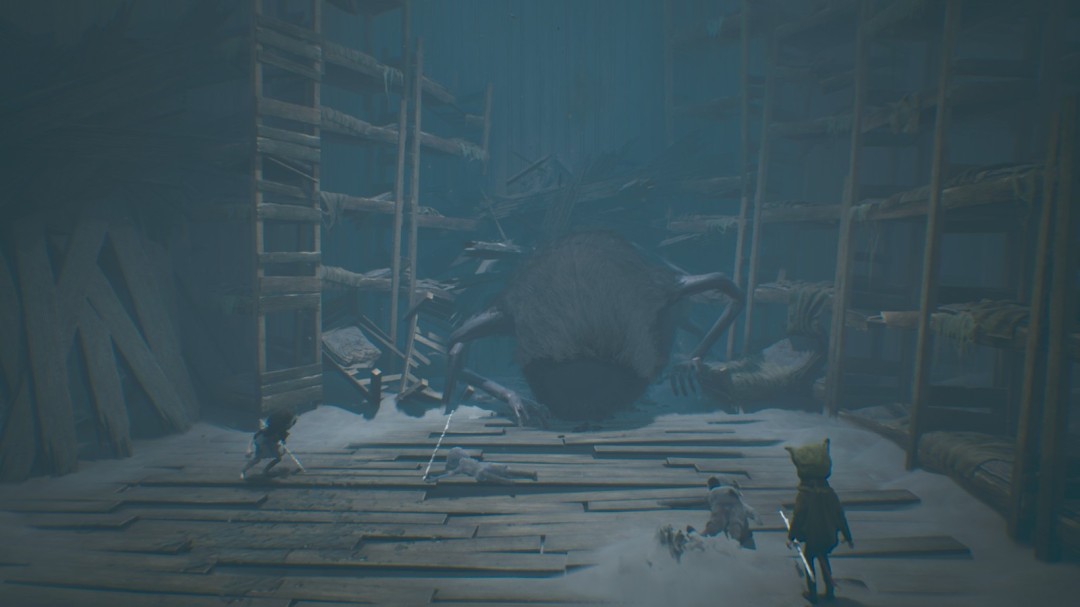 在章节最后和蜘蛛母体的boss战中,每一次母体攻击后会生成2-3只幼体,你需要使用鱼叉射击其中的1只幼体(时间不够射击第二只),重复10次。(不要先击杀母体,否则幼体不会再刷出,且剧情会继续推进,如果不小心击杀了母体,它会从洞穴离开,此时可以快速重新读档)