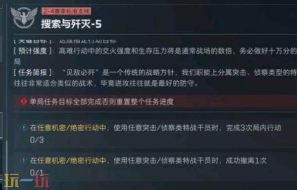 在任意机密/绝密行动中,使用任意突击/侦察类特战干员时,完成3次局内行动。