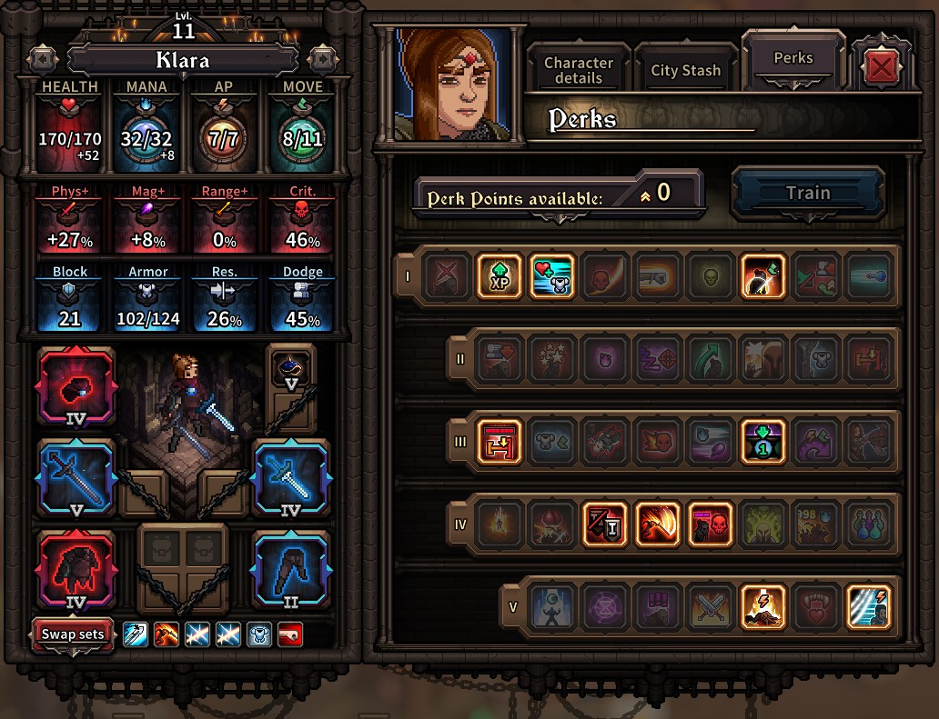 缺点:大招“巨量冲击”在第12夜之外基本派不上用场。如果你还没注意到,我们面对的可不是几只超大型僵尸,而是成群结队的僵尸潮。如果你想在战斗中占有一席之地,就必须依靠数量优势;而剑士却恰恰相反,他们追求的是质量而非数量。他们擅长单体输出,还能灵活地穿梭于零散的僵尸群中,打出一些精妙的突进技能。但归根结底,与其他顶级近战职业以及大多数弓箭手或法师相比,你的杀敌效率其实并不算高。原因在于,你可是游戏中对位置要求最高的武器。一旦遇到毫无空隙的大片僵尸群,你就只能落荒而逃,回到那燃烧的城墙边避难。除了“巨量冲击”之外,你的伤害输出本身也仅属一般水平。理想情况下,你应该优先堆满闪避属性,以便充分利用那些专为高机动性近战职业设计的优质装备,避免因身披厚重盔甲而拖累行动速度。不过,有时候强行堆闪避效果并不理想。更别提如果你的英雄还带有闪避惩罚的话——那些以护甲为核心的剑士反而会乐于被击中,因为他们能触发狂暴状态。而你呢?你偏偏要靠大量移动和频繁走位来生存,因此有时你会发现,自己竟身处僵尸群的边缘,而非居于核心地带——这才是真正依赖护甲的职业所渴望的位置。