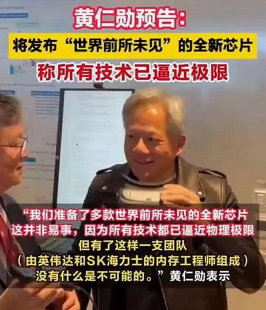 黄仁勋表示:我们准备了多款世界前所未见的全新芯片。这并非易事,因为所有技术都已逼近物理极限,但一切都充满挑战。”