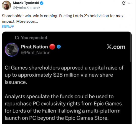 MarekTyminski在推上转发游戏博主Pirat_Nation的推文,并评论称即将达成一个股东双赢的局面,旨在为《堕落之主2》创造最大影响力。面对期待Steam版的玩家,他也给出积极回应。