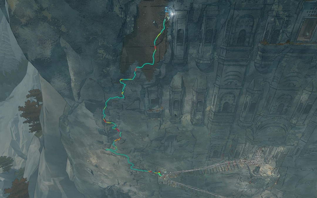 很多看起来蛮高的地方都没有30米,一个稳定触发的线路是爬风殿的左侧面,如图: