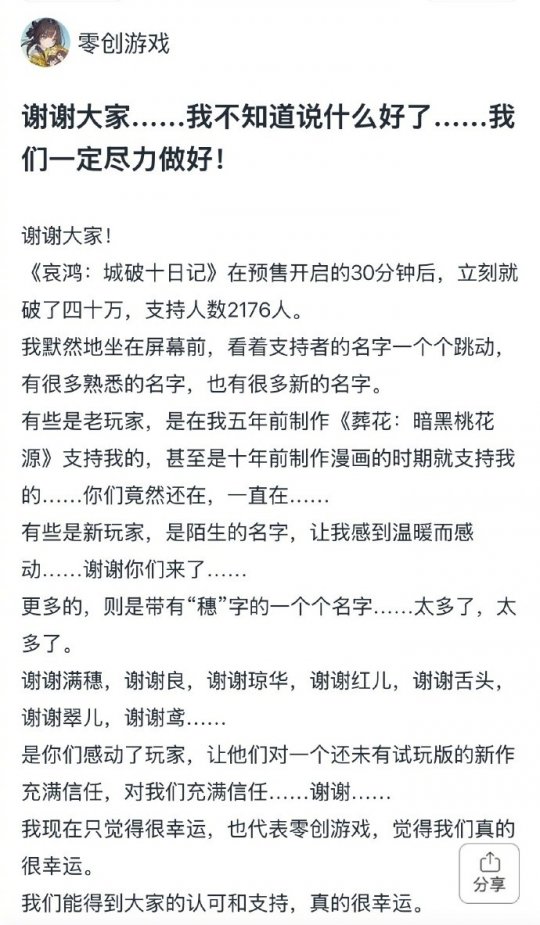 面对如此巨大的热情,工作室主创感叹仿佛置身梦境。他在屏幕前看着支持者的名字一个个跳动,其中既有陪伴了五年的老玩家,也有初次见面的新面孔,这种信任让制作团队感到幸运。