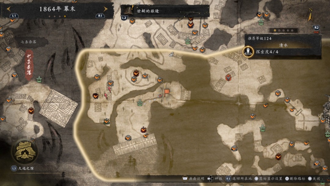 【追寻稀有的妖怪】为幕末时代【清水】的隐藏任务,大地图上不会显示。需要完成同样的隐藏前置任务【百怪绘卷】,位置在【平安-贺茂村落】,触发位置大致如下图