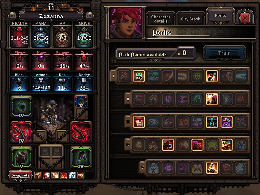 缺点:双持弩的全部技能都与任何机制无关。没有机会主义,没有孤立状态,也没有蓄力效果。这使得它显得平庸无奇,将升级和装备搭配的选择也局限在了最普通的选项上。此外,这位弓手必须投入大量移动点数,因为她的技能对位置要求极高——而大多数其他弓手只需少量投入甚至完全不用投入这一属性。更糟糕的是,她的技能还额外附带精准度惩罚,这一点其他弓手(拥有相近射程)却能通过“挑拣”来忽略。重型箭矢居然能绕过格挡——真是令人哭笑不得——但通常具备格挡能力的怪物本身也都有重甲防护,而且这种箭矢根本无法穿透护甲。这是一款极其乏力、令人困惑的武器,用它的人无一例外都会成为累赘。如果你想挑战一下,或者你就是个受虐狂,不妨试试看。不过话说回来,如果你真是个受虐狂,干脆直接选个权杖战法师好了——那把武器虽然同样糟糕,但至少还有独特的玩法和有趣的装备搭配选择。猎人本想扮演一种近战远程混合型单位,就像手枪那样,可她的几乎所有技能都得等脱离近战范围后才能使用。也就是说,你连“狂暴”或“肾上腺素激增”都享受不到!为什么啊!?