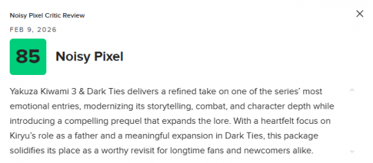 《如龙极3/如龙3外传 Dark Ties》将于2月6日正式发售。近日,本作的媒体评分也已解禁。截至目前,《如龙极3/如龙3外传 Dark Ties》M站媒体均分为75分,共收录40家媒体。其中,IGN给出了7分的评价。