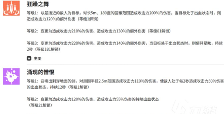 利用贝拉纳的第一个狂躁之舞技能,它可以快速接近一个敌人作为自己的主要目标,造成的范围攻击当中是可以给敌人带来200%的伤害,并且给敌人带来的出血状态是可以持续叠加起来,出血状态是让敌人处于一定负面效果的时候可以受到120%的额外伤害,另外后期进行变更的话,则会给敌人带来2秒的眩晕控制,而在涌现的憎恨这个技能效果上面,贝拉纳带来的是召唤地面的剑,进行输出的话,会对周围半径2.5m的范围之内的敌人造成110%的攻击,此时只要对敌人进行输出的话,其中每2秒就可以造成50%的额外伤害,而且在其中同样是通过出血状态带来这样的额外叠加,所以在持续秒的时间之内,贝拉纳可以触发足足6次这样的伤害,叠加起来的持续出血状态,也可以让贝拉纳在后期解锁的整体输出时间上面更长一些。