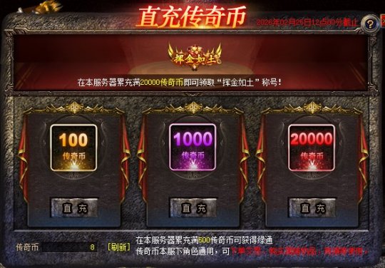 注意事项:(1) 累计充值数据统计可能略有延迟,我们将在1个工作日内为符合条件的玩家添加绿通服务。(2) 游戏内元宝兑换传奇币不计算在内。(三)“挥金如土”称号活动期间,在“百区合击”服务器累计“预充值”达到20000传奇币的游戏账号,将获得且仅可获得1次“挥金如土”称号。该称号将自动发放给该充值账号下第一个进入服务器的角色。