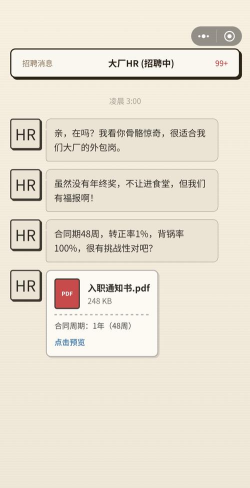 除此之外,还模拟了大厂HR招聘的真实过程,老板给你画的大饼你还敢吃吗?在线编辑你的数据,从姓名到年龄到期望的薪资,经过数据筛选,找寻到最适合你的大厂外包岗位,每一次的信息填写不同玩家所获得的offer内容也不同,在游戏中可谓处处充满惊喜,