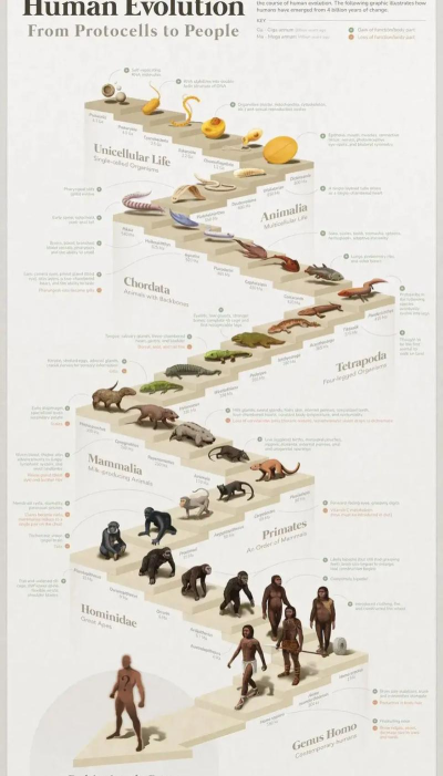 细胞初萌启万程,演化无界向苍穹,玩家只需点击屏幕,收集进化点数,再用这些点数解锁进化路上的各类生物、技能和文明成果,一步步推动进化进程,从简单到复杂的整个历程,内容极为丰富,拥有庞大而完整的进化树,玩法层层递进,永不枯燥,同时,游戏内置了大量知识小卡片,每解锁一个新的进化节点,都会弹出相关的科普知识。