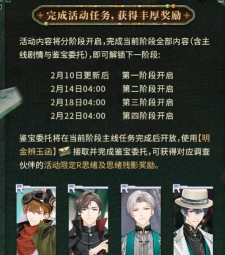 除卡池外,主线剧情活动“珍宝解密”同步开启。玩家需与四位调查伙伴协作,逐步揭开古籍珍宝背后的隐秘往事。活动全程采用分阶段开放模式:首阶段于2月10日版本更新后立即解锁,末阶段将于2月22日正式开放。每个阶段均配套独立主线章节与鉴宝委托任务,后者需在完成当期主线后,通过道具“明金辨玉函”接取并交付。