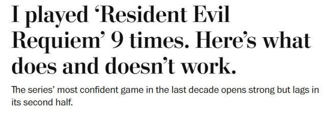 而接下来这位更是高手,来自《华盛顿邮报》的记者吉恩·帕克在PC和主机上通关九次《生化危机:安魂曲》后,展示了2.5小时的成绩,证明了本作在速通方面拥有巨大潜力。值得注意的是,这位记者首次通关耗时近16小时。