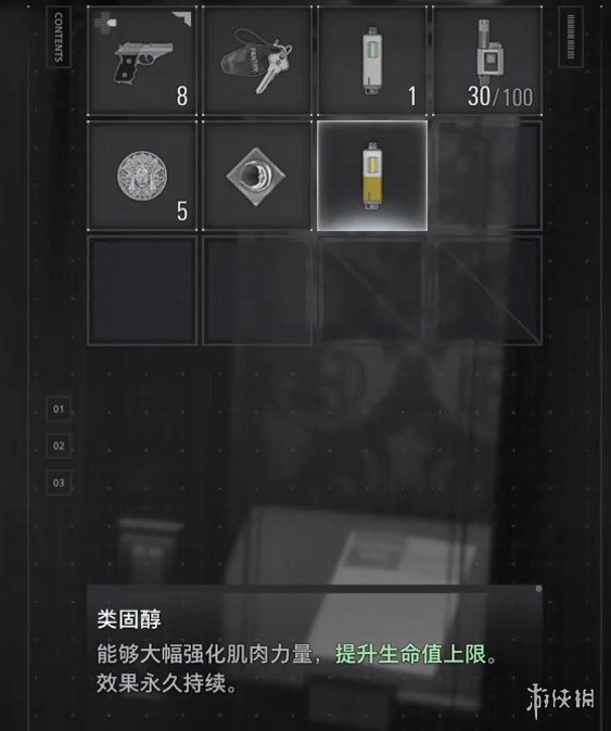 《生化危机安魂曲》的类固醇能够大幅强化肌肉力量,提升生命值上限,效果永远持续。在疗养院的游乐室展示柜,玩家可以使用4个古钱币换取一只类固醇。
