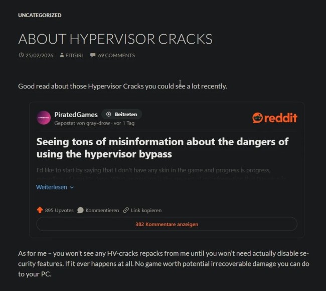 知名游戏压缩打包组Fitgirl近日表示,不打算对通过虚拟机监视器技术攻破D加密的游戏制作高压镜像。