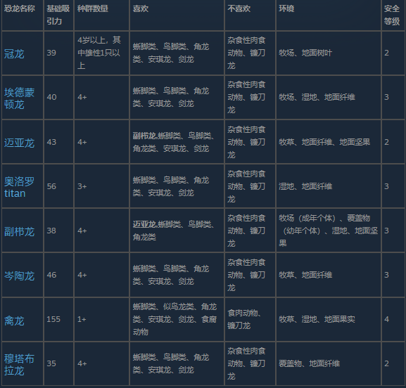 鸭嘴龙是您草食动物群落的绝佳补充,因为它们能与所有其他类型的草食动物和睦相处。其中,只有副栉龙和迈阿萨拉龙在各自群体内彼此“喜欢”对方,因此将它们放在一起饲养是个不错的选择。