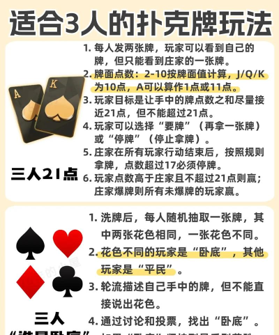 3、实用技巧,提升胜率知道了规则,我们来聊聊技巧,技巧能让游戏更有趣,记牌很重要,不需要记下所有牌,但关键牌要留心,比如“斗地主”里的大小王和2,记住它们是否打出,能帮你判断局势,控制出牌节奏,有时候,忍耐比出击更重要,保留关键牌,往往能后发制人,然后,观察对手也很关键,通过他们的出牌习惯和表情,你可以猜测他们的牌型,从而调整自己的策略,保持良好的心态,游戏重在参与和欢乐,输赢别太放在心上,特别是和家人玩时,开心才是第一位的。