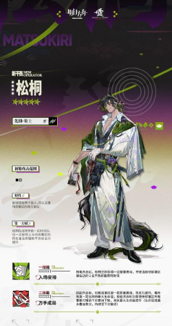 松桐的职业是先锋策士,作为新分支职业,根据特性猜测是辅助其他各种职业的,他的特性能够帮助阻挡两个敌人,并且可以支援待部署区的队友,松桐的天赋是在战场上停留一段时间后,就会让场上和待部署区所有重装和辅助干员的攻击力提升,该效果一场只会触发一次。
