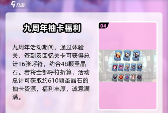 呼符方面,体验关送1张,签到10天10张,回忆关卡中的额外5张,总共16张,基本相当于48颗圣晶石。如果将全部呼符折算在内,整个九周年活动总计可以获得约610颗圣晶石的抽卡资源,可谓诚意满满。