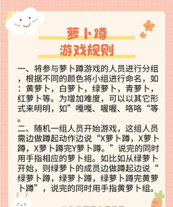 目的:可以训练注意力的敏捷性将孩子分成人数相等的三组,一组代表红萝卜,一组代表白萝卜,一组代表黄萝卜。老师喊口令:“红萝卜蹲,黄萝卜蹲,白萝卜不蹲。”喊哪一组蹲,哪一组要快速蹲下。喊另一组,前一组的孩子要快速站起。未按口令动作的孩子算失败。(也可以由孩子来发令)