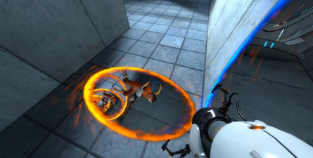 2、独特的工作原理:创造虫洞那么,它到底怎么用呢,原理其实很有趣,这把枪可以发射两种“门”,一种是蓝色的入口,另一种是橙色的出口。