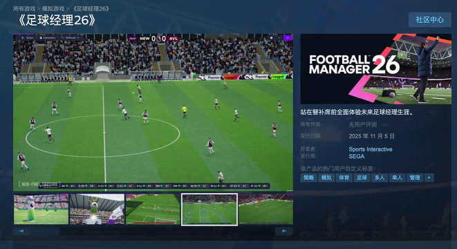 足球经理2026将于11月5日正式发售,支持Xbox Series X|S、PS5、PC和Mac平台,而Switch版本将于12月4日上市。目前,该游戏已经在Steam平台上线,原价为268元,首发期间享受9折优惠,价格为241.20元。此外,预购游戏的玩家将在11月5日发售前的两周内提前体验游戏。