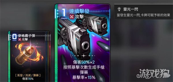 路克初始拥有两张攻击类起始卡牌,每张可造成100%基础伤害,并配备一张消耗1点能量的技能卡暗影隐身”,使用后可获得护盾效果。其核心卡组中的第一张关键卡为连续击发”,该卡可进行两次50%伤害的打击,依据暴击次数生成对应数量的手枪弹药,同时提升自身15%暴击率。由此可以看出,当路克的暴击属性达到85%时,基本可实现每次攻击必爆。他总共能生成四种0费手枪弹药:曳光弹、贫铀弹、银弹等。不同弹药具备差异化功能,例如银弹可施加弱点状态,贫铀弹则对带有护盾的目标造成额外伤害。