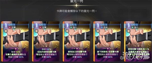 可以赋予新的效果的技能卡第一张攻击牌是G和弦,他会对敌方输出100%的攻击,并且当友军进行输出的时候还能够对目标进行夹击100%的输出,而他在经过灵光一闪之后,会获得5个方向的增益,第一个是可以增加伤害150%,夹击输出不变;灵光一闪的第二张则是可以在额外增加一回合内使用攻击卡牌;第三张则属于强化在使用自己的攻击卡牌后,就可以随有队友一起夹击输出;第四张则是可以使用两次攻击卡牌;第5张卡牌可以有30%的概率对敌方进行夹击,并且直接增加夹击伤害的30%。