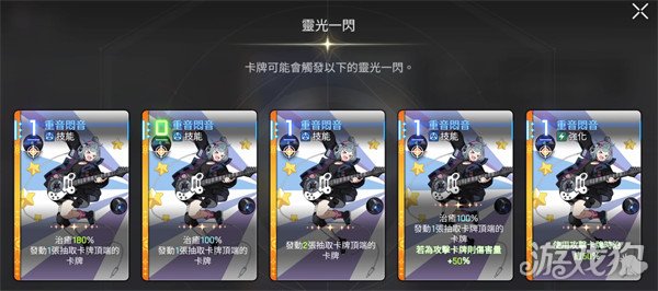 接下来就是重音闷音,技能闷音人生可以对队友进行100%的治疗并且能够发动一张抽取卡牌顶端的卡牌在经历过灵光一闪之后也会获得5个选择;第一个是可以治愈180%,其他不变;第二则是没有什么其他的争议;第三种则是能够发动两张抽取卡牌顶端的卡牌,但是没有治愈效果;第四种是在原有技能的基础上,如果是攻击卡牌增加伤害量50%;第5个就是能够直接使用攻击卡牌的时候治愈血量50%,但是无法发动抽取卡牌的技能。