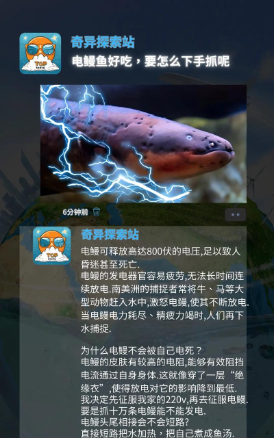 2、开放世界的奇幻冒险如果你喜欢更自由的探索,可以试试《方舟:生存进化》,在这个恐龙世界里,海洋区域同样精彩,电鳗是强大的水下生物,它会释放电流攻击,让你和你的坐骑瞬间麻痹,驯服它需要技巧与勇气,但成功后,它将是你探索深海的得力伙伴。