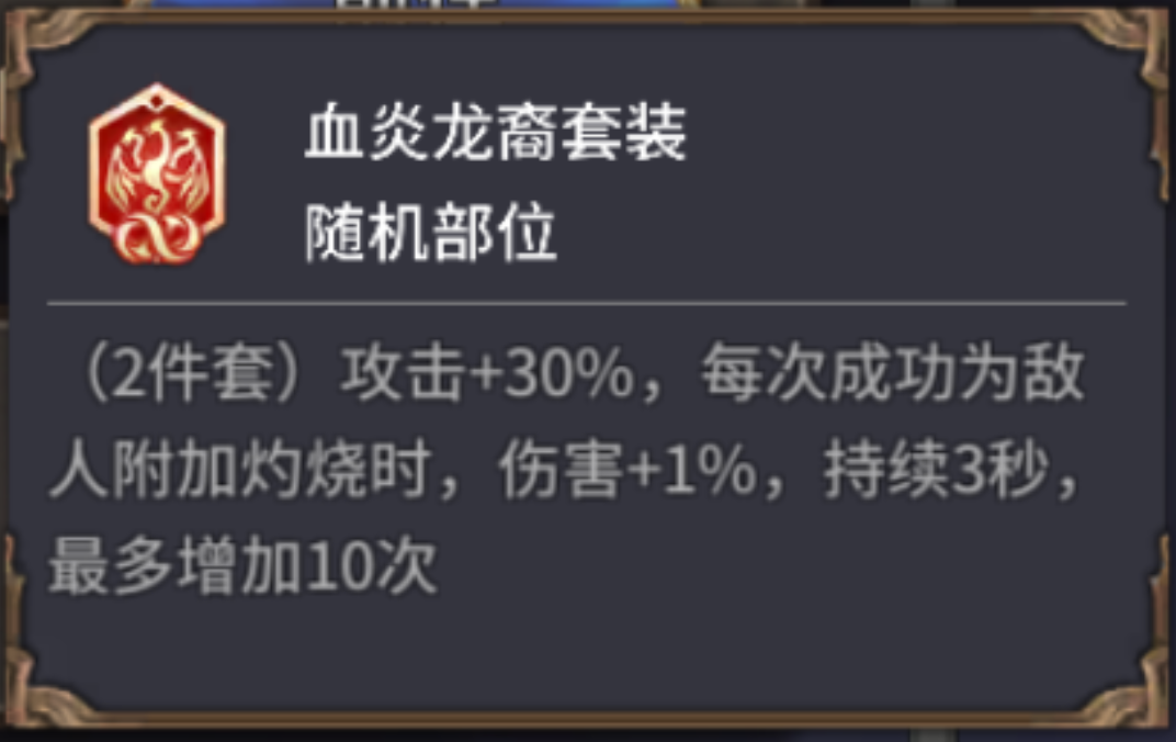 血炎龙裔与丹妮莉丝契合度极高,有条件可以优先选择。首先是提升30%攻击,此后造成灼烧可提高伤害,在持续施法场合可维持至高10%的增伤。如果没有,可以用邪恶复仇下位替代,词条方面,主词条选择攻击加成,副词条优先选择攻击、暴击率、暴伤、攻速等词条。
