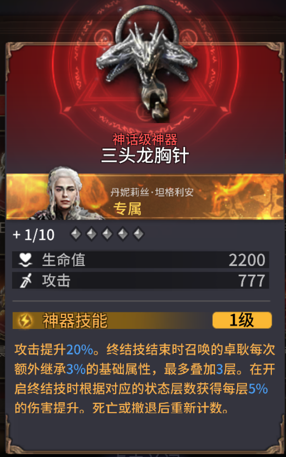 专武可提升自身攻击,并且可使卓耿可叠加基础属性、增伤,在持续输出的场合可逐步提高伤害,能够显著提高输出。如果专武等级较低,可用通用神器暮色泪滴下位替代,也能提升丹妮莉丝输出。