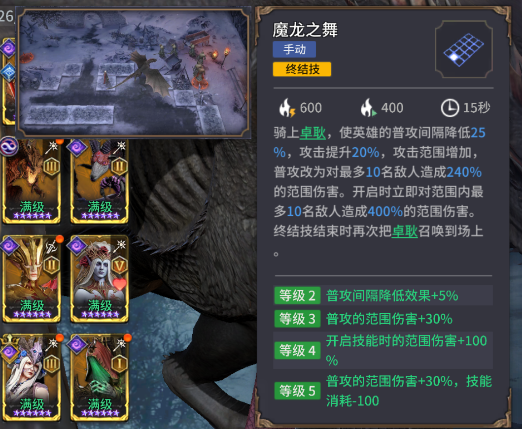 魔龙之舞:丹妮莉丝基础数值较高,再加上攻击间隔降低、攻击增益,终结技开启后15秒内,可持续通过普攻打出高额群体伤害。这个终结技最大的特点是仅600怒气消耗,可以更高频的释放大招、连续清杂。