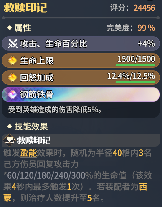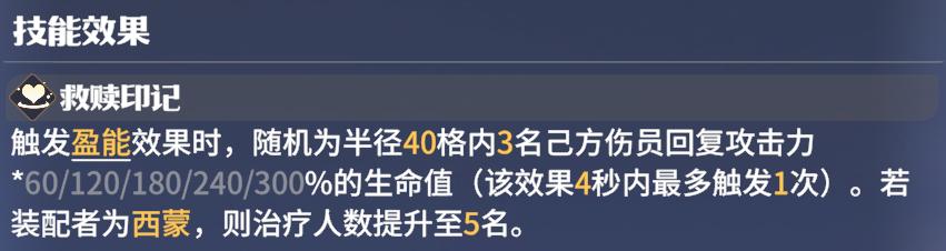 1、救赎印记: 触发盈能效果时,随机为半径40格内3名己方伤员回复攻击力*60/120/180/240/300%的生命值(该效果4秒内最多触发1次)。若装配者为西蒙,则治疗人数提升至5名。