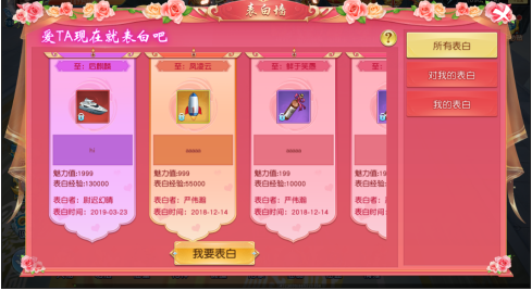 修仙路漫漫,《诸世王者》则引入了情缘系统,玩家可以通过展示对心仪之人的表白信息,提升对方好感,促使双方结为姻缘。使用不同的表白道具,可以提升表白双方的魅力值表白经验、表白积分,表白经验可用于提升表白等级,增加大量战力。表白等级的详细信息在情缘-表里面。