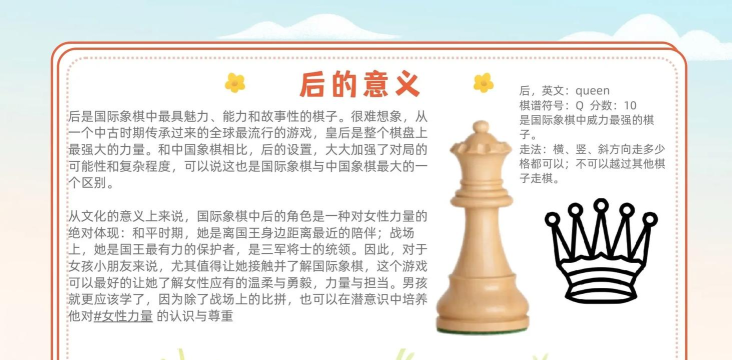最后是残局的决胜技巧如果棋下到了残局,棋盘上的子不多了,这时候,每一步都要小心,因为可能一步错,就满盘皆输,如果你的皇后还在,优势会很大,要利用它,去逼迫对方的王,把他赶到角落,或者,配合其他棋子,形成杀棋,如果双方皇后都没了,那就要靠小兵了,想办法让你的兵,冲到对方底线,升变成皇后,这样,胜利的天平,就会向你倾斜。
