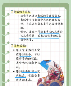 每天凌晨五点,系统会自动刷新,这是最基础的来源,然后每日任务也会给,记得一定要做完,还有活动奖励,经常送疲劳药水,别忘了领,另外升级也会回复,但后期就少了。