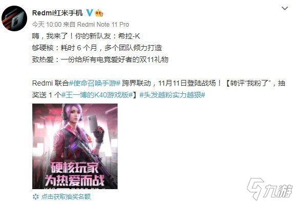 据了解,Redmi联合《使命召唤手游》跨界联动,推出了K40游戏增强版这一联名角色,11月11日登陆战场。官方表示该角色是给所有电竞爱好者的双11礼物,耗费6个月,多个团队倾力打造。