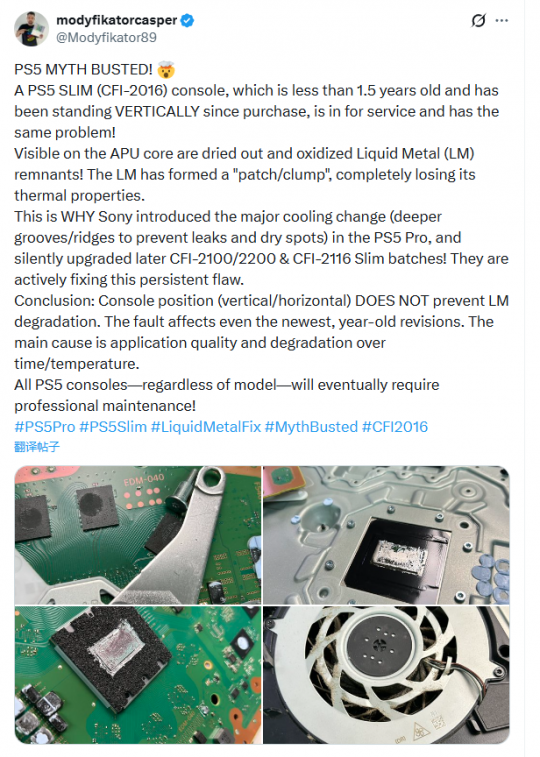 该预警源于改装者兼维修技术人员Modyfikatorcasper在社交媒体发布的案例分析。他展示了一台使用不足一年半的PS5 Slim(型号CFI-2016),其位于加速处理器单元与冷却系统之间的液态金属已发生明显退化。材料出现干涸、氧化,并凝结成块状,完全丧失了将芯片热量高效传导至散热器的关键物理特性。